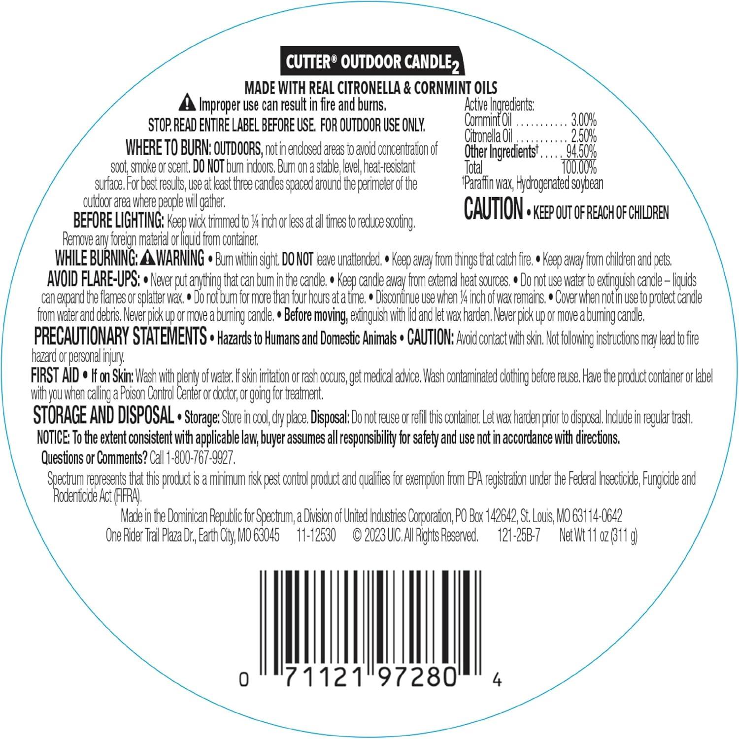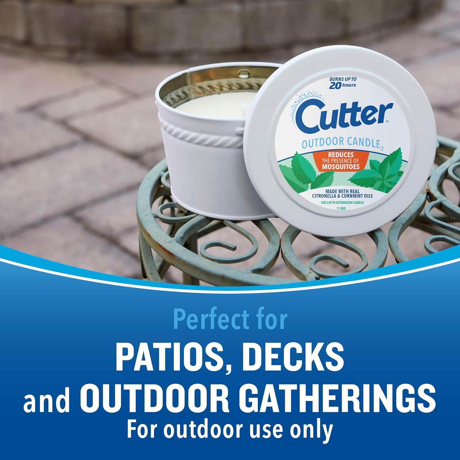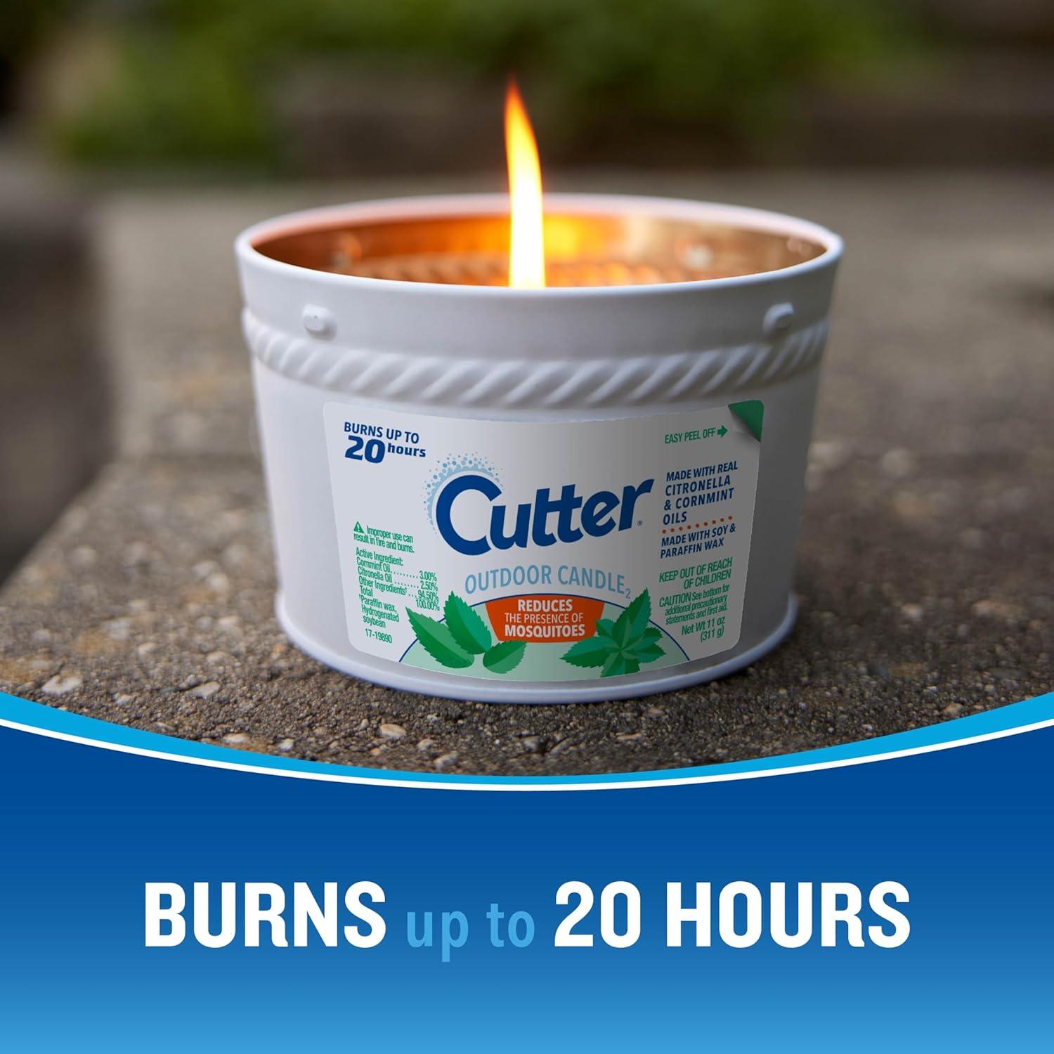 Cutter® Outdoor Candle2, made with real citronella oil and cornmint oil, reduces the presence of mosquitoes and enhances your outdoor space. This 17-ounce, single-wick soy wax candle burns for up to 30 hours, bringing an attractive glow and warm ambiance to your deck, porch, or patio. You’ll love the light, fragrant citronella and mint scent. The decorative container adds style and blends well with your patio decor. STOP. READ ENTIRE LABEL BEFORE USE. Cutter® Outdoor Candles are for outdoor use only. Burn on a stable, level, heat-resistant surface. Remove any foreign material or liquid from the container. Do not use if the container is cracked, chipped or damaged. Do not leave the candle unattended and keep it away from children and pets. See label for complete instructions and precautions.